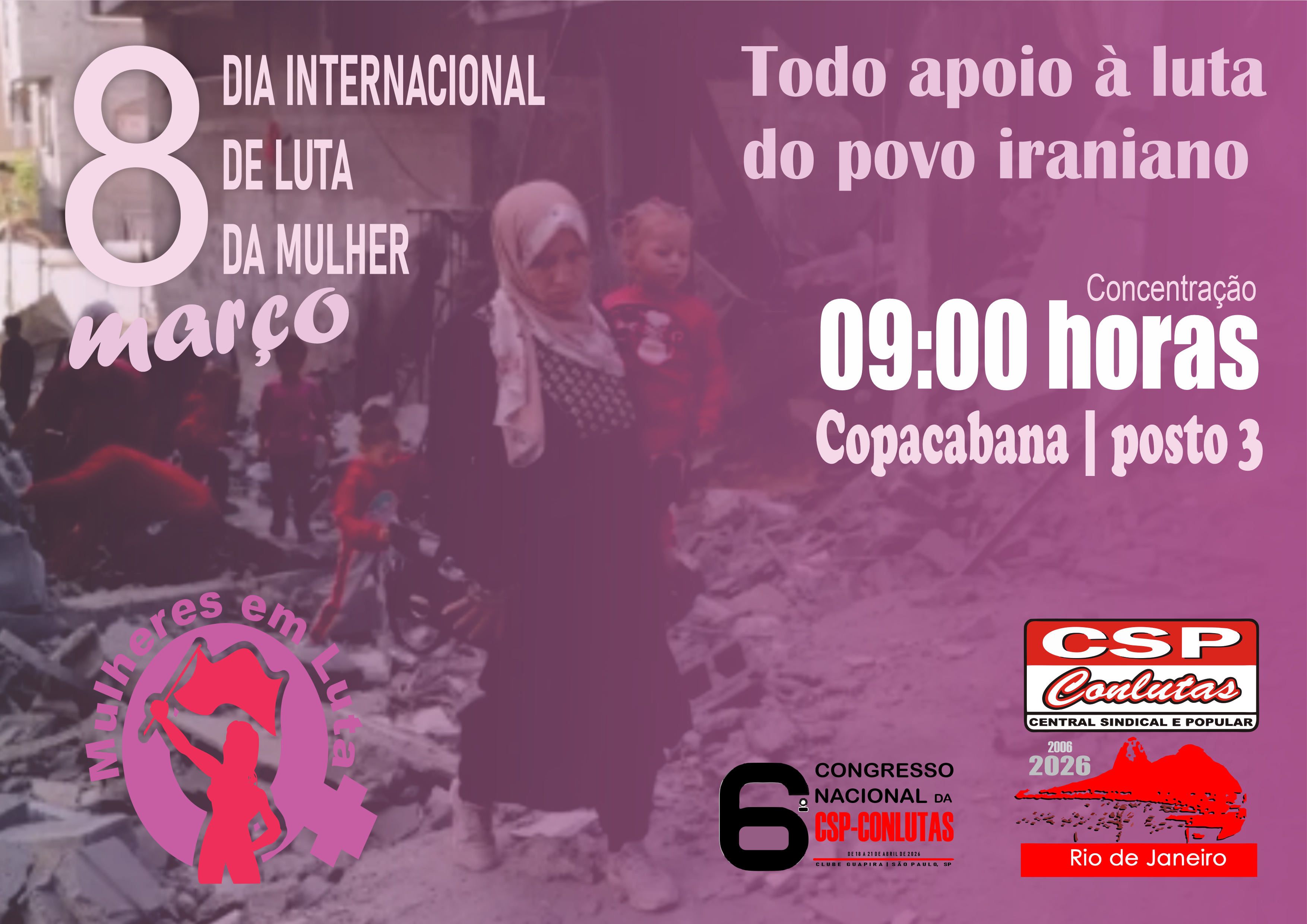 Todas e todos às ruas. Nesse domingo, dia 08 de março participe da mobilização. Concentração em Copacabana, às 09:00 h, no Posto 03. Imagem: CSP-Conlutas RJ