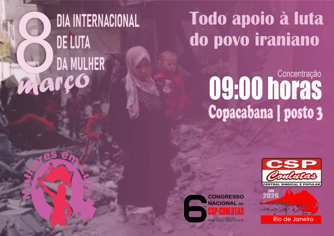 A CSP-Conlutas faz um chamado geral a participação nas manifestações do 8 de Março. Todas e  todos às ruas para denunciar a violência contra a mulher, exigir políticas públicas do governo Lula e rechaçar o imperialismo e o extremo liberalismo mundial. Atividades de convocação das manifestações e da luta em defesa da vida da mulher estão ocorrendo em diversas bases de categoria essa semana. A essa devem se somar a denúncia das guerras provocadas pela classe dominante. Também expressar de todas as formas a solidiariedade a mulheres e homens trabalhadores do Irã. Convocar as estadunidenses e israelistas para se mobilizar e derrotar as elites que dirigem seus países. Essa tarefa é de todos nós!