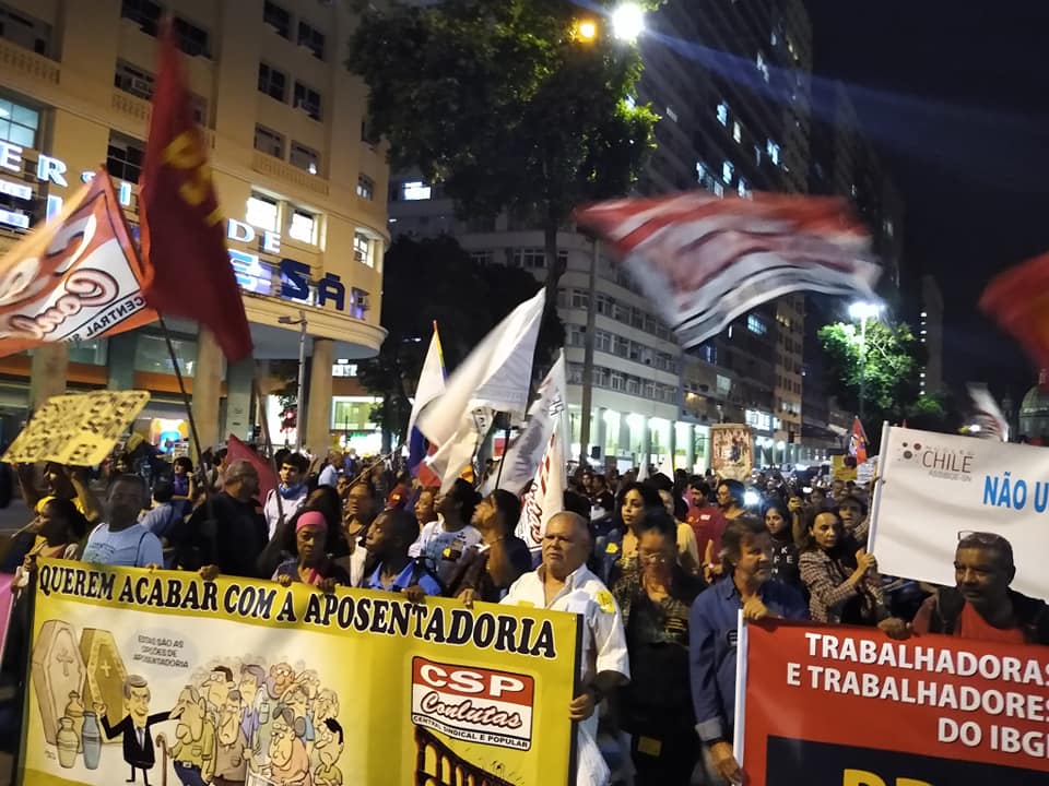 O ato convocado a partir das 16 horas reuniu cerca de 10 mil manifestantes. Entre esses estavam servidores públicos, petroleiros, metalúrgicos, pedreiros, ferroviários, metroviários, rodoviários, carteiros, bancários, domésticos, trabalhadores com carteira assinada, trabalhadores informais, estudantes e a juventude. Faixas, cartazes ecoavam os discursos e palavras de ordens que denunciavam o desmonte da seguridade social e o fim do direito à aposentadoria pretendida por Bolsonaro e Paulo Guedes.