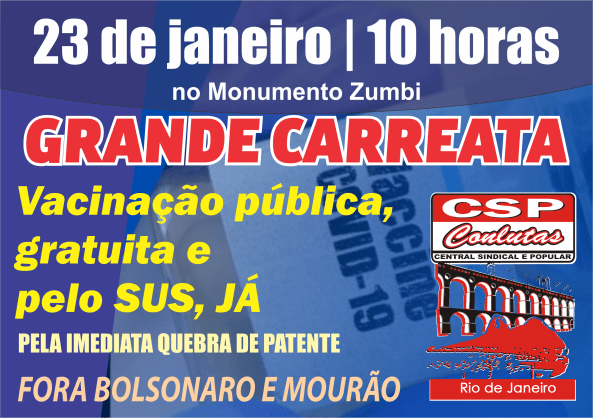 Nesse sentido a CSP-Conlutas se junta a outras dezenas de entidades para convocar carreatas. Essas carreatas exigem acesso à vacinação o mais rápido possível. O Brasil possui tecnologia para produzir milhões de vacinas rapidamente e vasta experiência em campanhas de vacinação em massa. Aqui no Rio, será nesse dia 23 de janeiro, com concentração às 10 horas, no Monumento a Zumbi dos Palmares, na Avenida Presidente Vargas, no Centro do Rio de Janeiro. Mas não estaremos sozinhos. Veja a lista abaixo das carreatas pela vacinação para todas e todos pelo país: