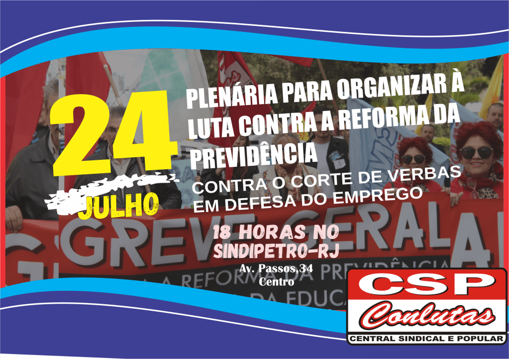 Como partes da busca por essa unidade e a construção de uma nova greve geral, que pare a produção e distribuição das riquezas, a Secretaria Executiva Estadual da CSP-Conlutas RJ convoca uma Plenária para a organização das atividades no início do segundo semestre legislativo. Desta forma cumprimos as orientações do Calendário de Lutas deliberado pela Reunião da Centrais Sindicais.