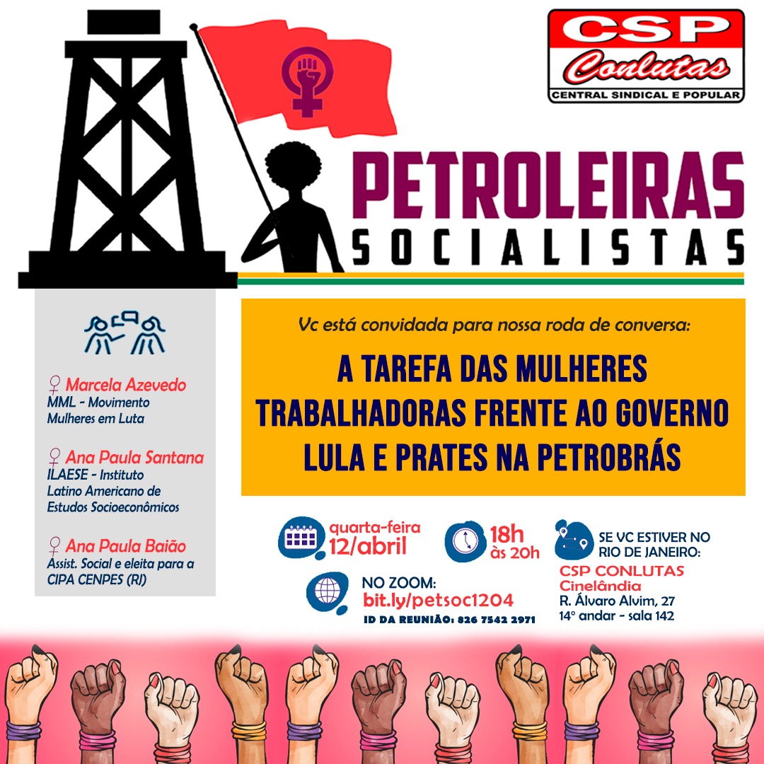É com a certeza de que teremos que nos mobilizar muito para recuperar nossos salários e direitos e avançar na pauta das mulheres, que te convidamos para vir debater conosco estes e outros temas na plenária do Coletivo Nacional Petroleiras Socialistas.