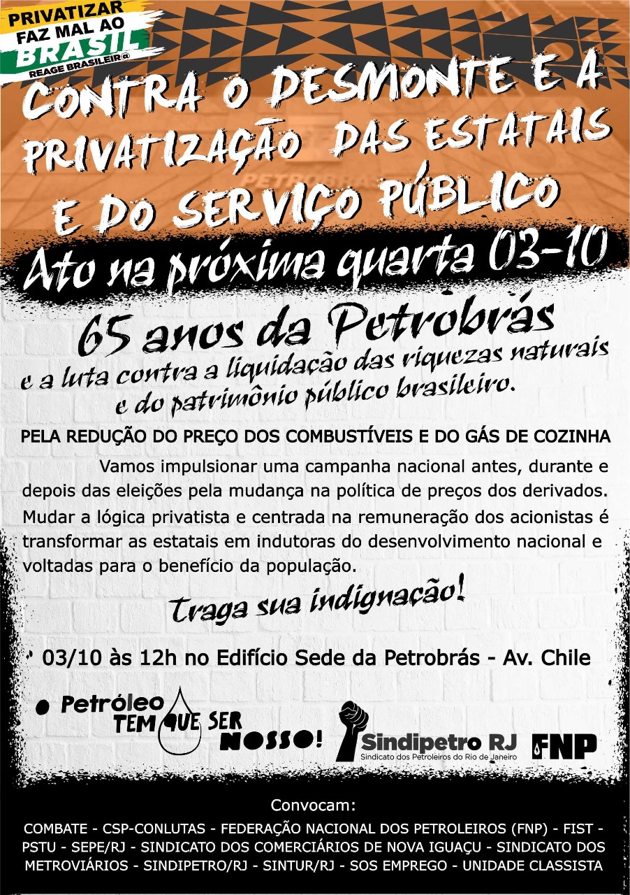 Utilizaremos essa data para fortalecer a luta contra a liquidação das riquezas naturais e do patrimônio público. A manutenção da Petrobrás 100% estatal é a proteção dos preços dos combustíveis do gás de cozinha.