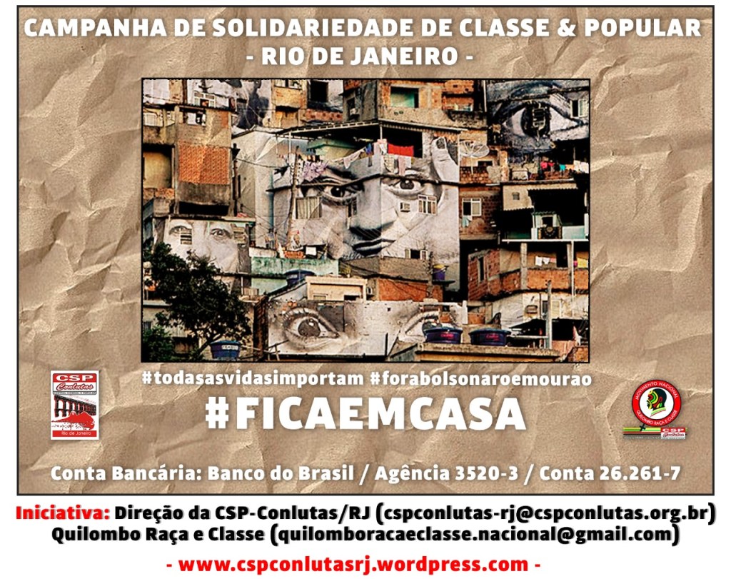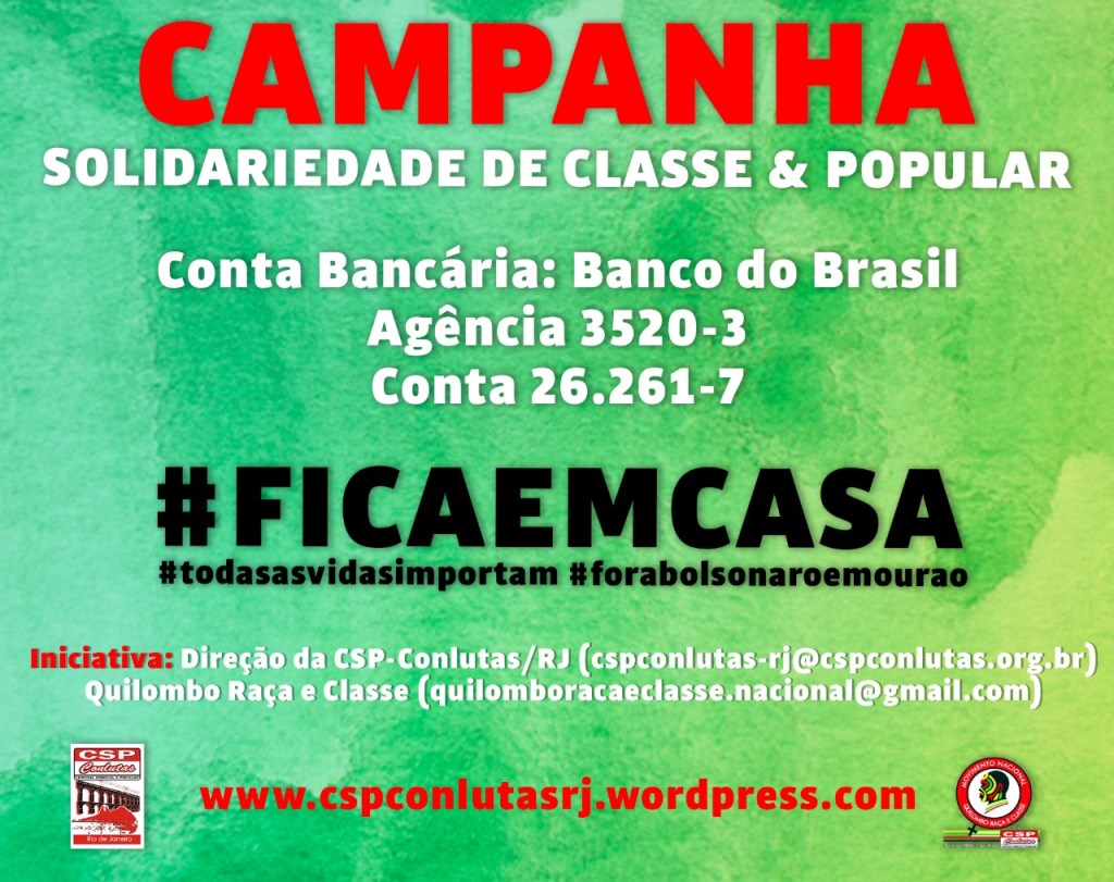 - Entidades e pessoas contribuam essa campanha solidária par nossa classe trabalhadora, desempregados e sub empregados e a população pobre e negra que necessita continuar vivendo e Lutando Sempre! efetuar o depósito nesta conta da CSP CONLUTAS RJ