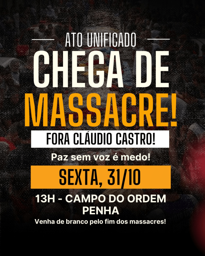 Todos ao ato “Chega de Chacina! Fora Cláudio Castro”, às 13 horas, na Estrada José Rucas, nº 1202-1326 – Penha, Rio de Janeiro – RJ | 21070-370