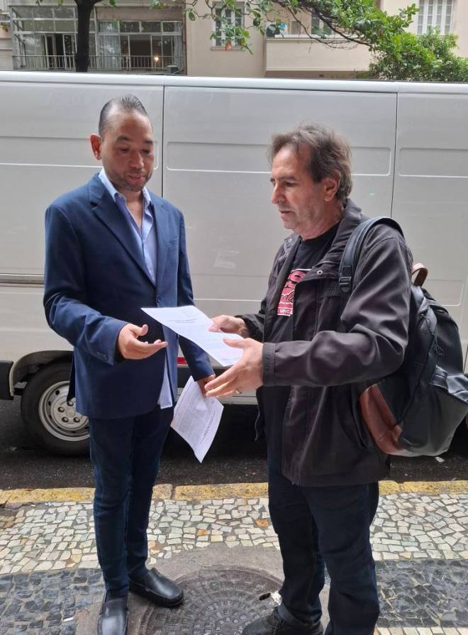 Imagem de Elisa Guimarães cedida a CSP-Conlutas | Na imagem o funcionário do Cônsul abordado por Luiz Sérgio Ribeiro, da Executiva Estadual da CSP-Conlutas RJ.