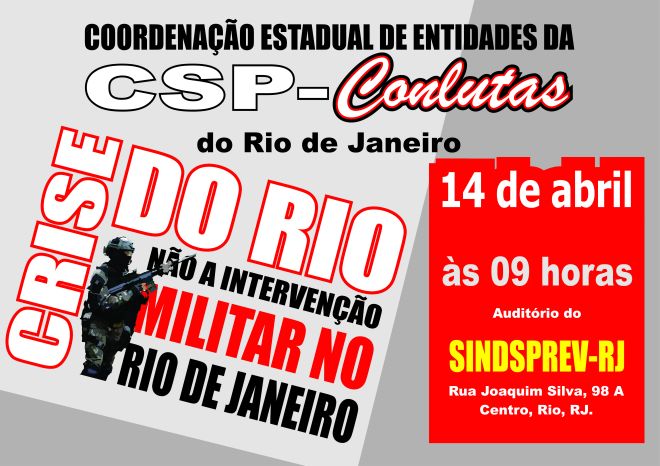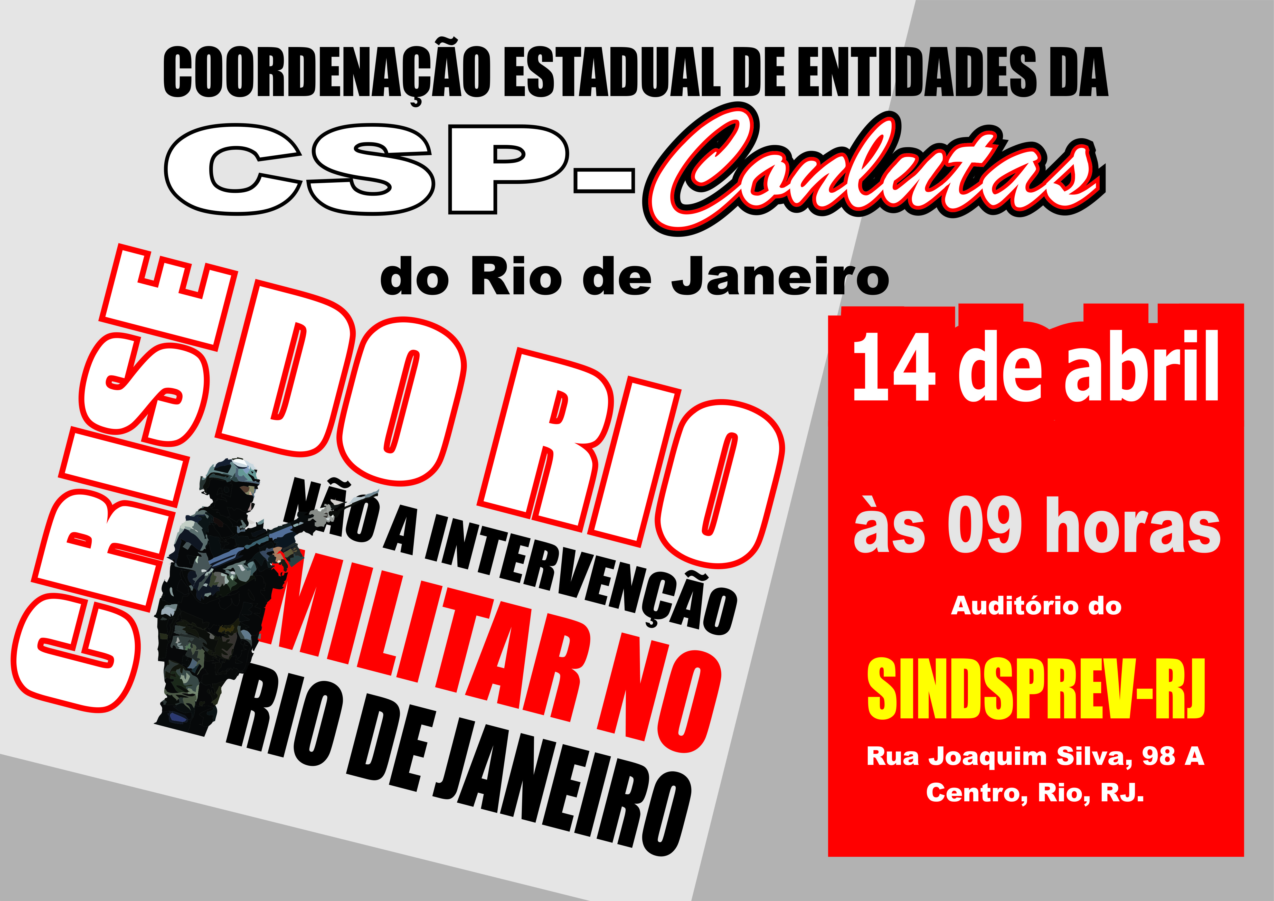 A Secretaria Executiva Estadual da CSP-Conlutas convoca todas as entidades e movimentos a eleger seus representantes para instalar nesse sábado, dia 14 de abril de 2018, a partir das 09 horas, no auditório do SINDSPREV-RJ, uma reunião ordinária da direção estadual dessa central. A SEE propõe que essa Coordenação Estadual de Entidades tenha como principal tarefa a construção de um programa que oriente a atuação da central frente aos graves ataques que sofremos. Devemos participar de todas as atividades que ocorrerão nesse dia, marcado por completar-se um mês da execução da vereadora e de seu motorista. Ao mesmo tempo queremos que esse dia entre para a história de nossa central como aquele em que produzimos uma alternativa dos trabalhadores para a solução da profunda crise do Estado do Rio de Janeiro.