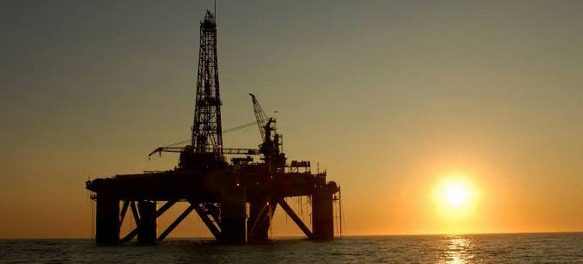A imagem da CSP-Conlutas. Ela mostra uma plataforma de petróleo em alto mar (offshore), também conhecida como plataforma de perfuração, ao pôr do sol. Essas estruturas são utilizadas para extrair petróleo e gás natural do leito no fundo do mar.