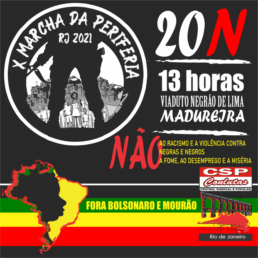 A CSP-Conlutas convoca a participação de todas as entidades, dos movimentos sociais e das trabalhadoras e trabalhadores na 10ª Marcha da Periferia, no Dia 20 de novembro, a partir das 13 horas, na Rua Carvalho de Souza, sob o Viaduto Negrão de Lima, em Madureira.